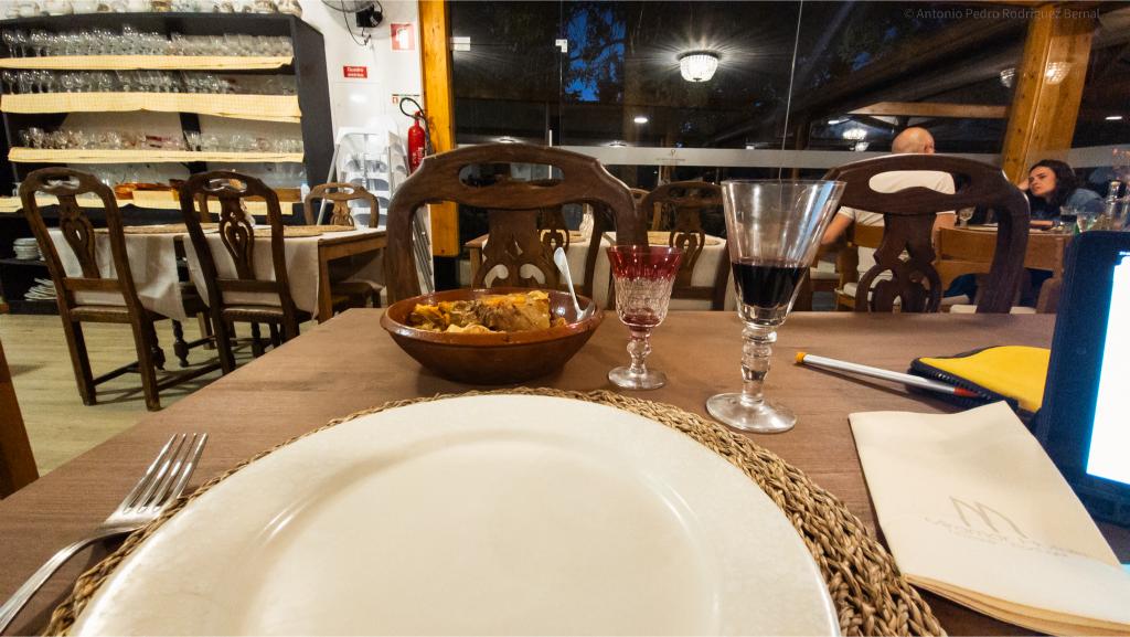 Es difícil no sucumbir a fotografiar platos de comida cuando están bien presentados. Todos ellos tienen, inmediatamente después, el ignominioso destino de ser devorados y consumidos por despiadados jugos gástricos. Es como si se fotografiase a un reo antes de ser ejecutado, no con ánimo documental sino con propósito lúdico-festivo. Sucumbí al primario instinto carnívoro y a la irremediable comisión simultánea de dos pecados capitales: la gula y la soberbia (de la que la vanidad es una de sus más graves manifestaciones) e hice algunas fotos. Debo decir que más allá del efímero destino del porco preto, el plato estaba exquisito. Realmente era un plato para dos personas servido en un recipiente de barro. El vino alentejano maridaba bien con el plato recién salido del horno. La carne era tierna y se hacía un hueco entre las patatas y las setas, todo mezclado aunque no revuelto. El factotum visitaba las tres mesas, solicitando el beneplácito de los comensales. Sin embargo, esas visitas no eran impertinentes ni inoportunas. No indagaba sobre el origen ni el destino de los clientes; se limitaba a explicar cómo había elaborado el plato y de dónde había sacado los vinos, que él mismo seleccionaba de bodegas vecinas.